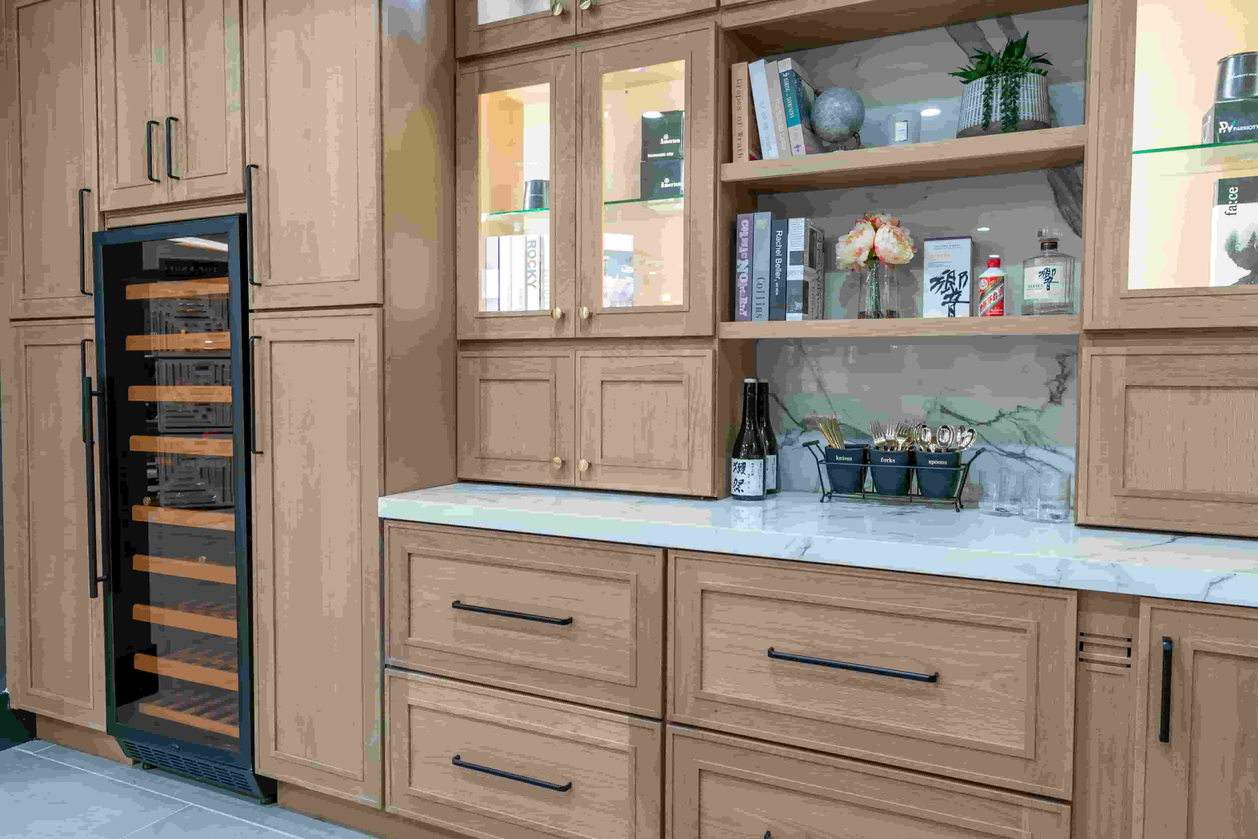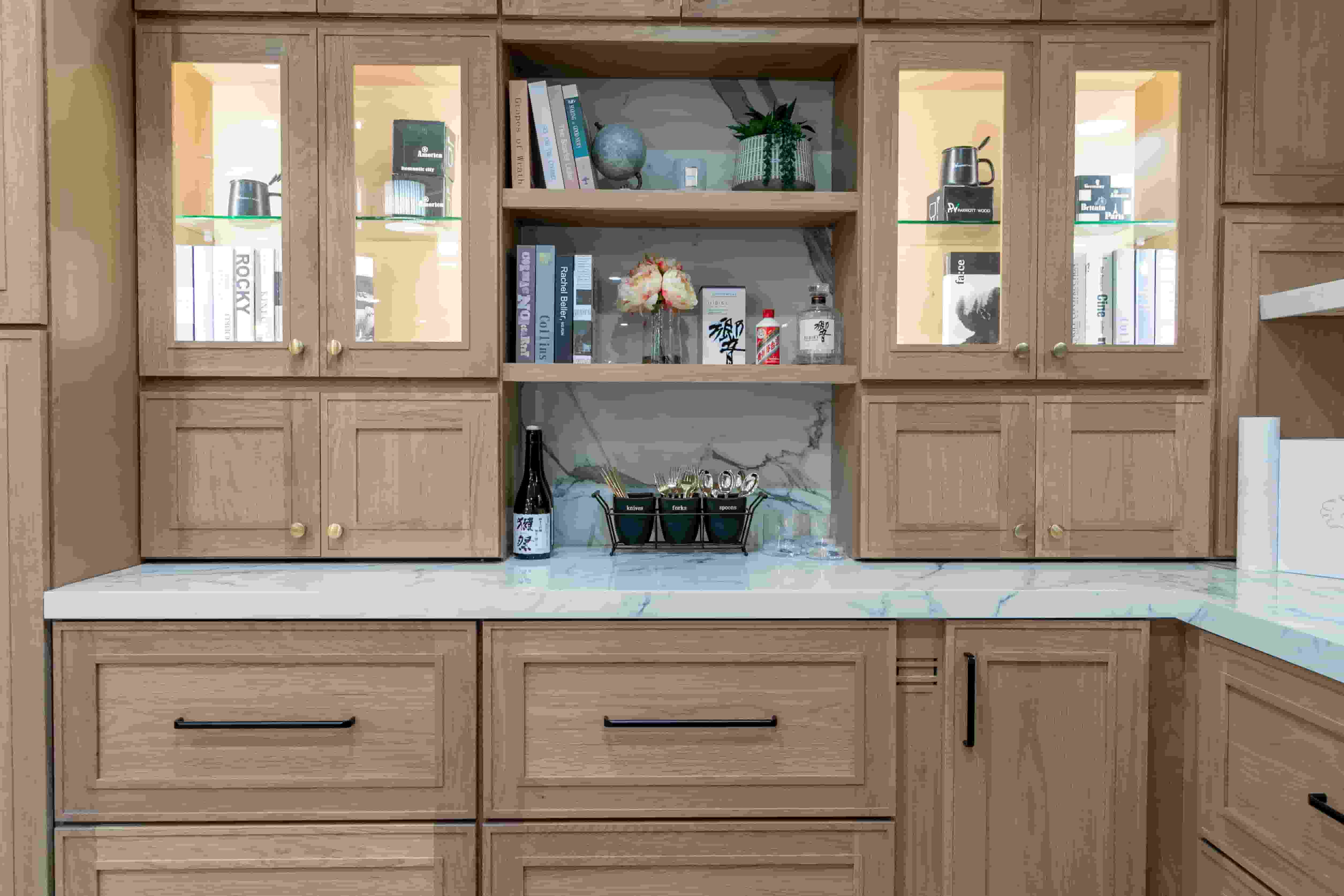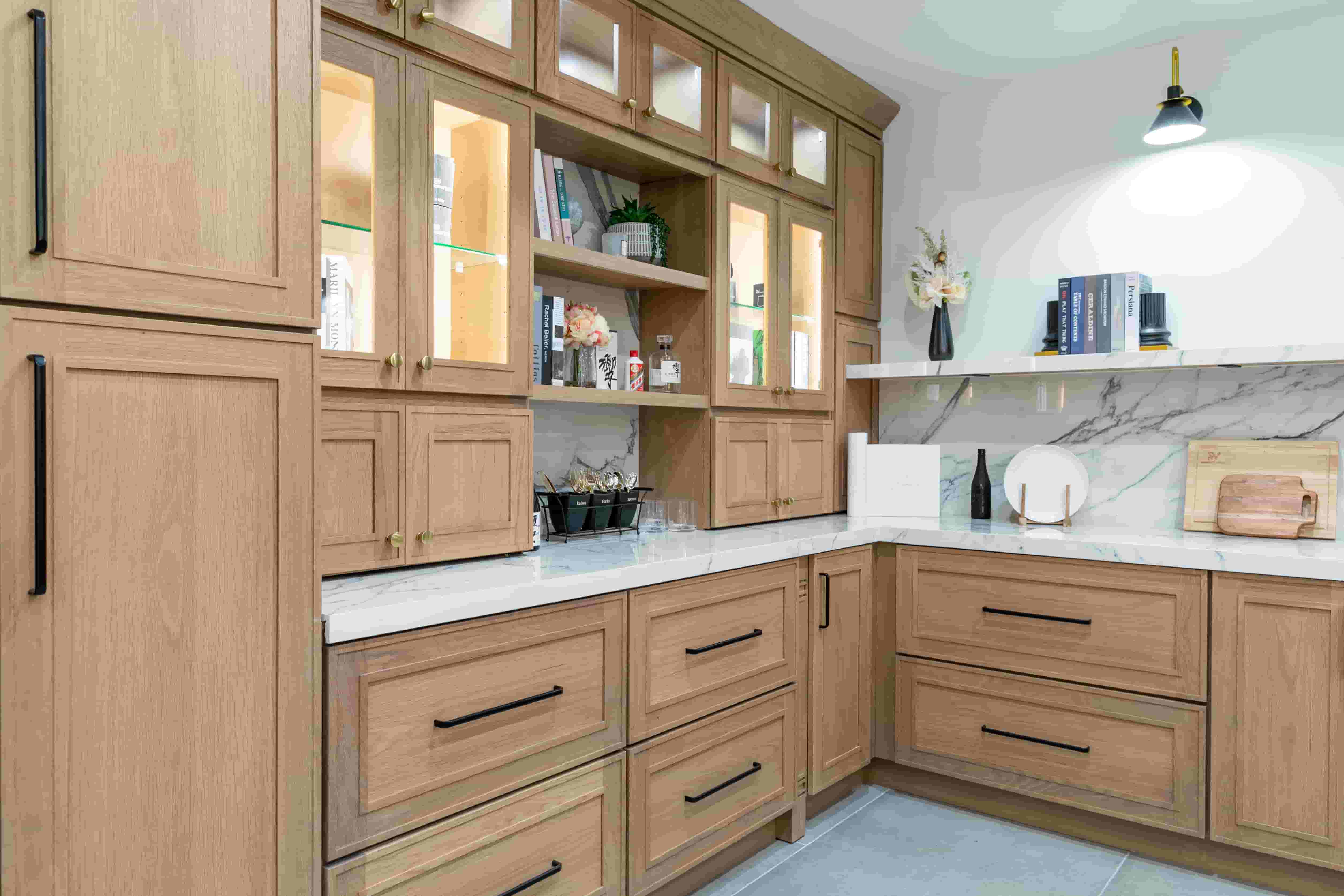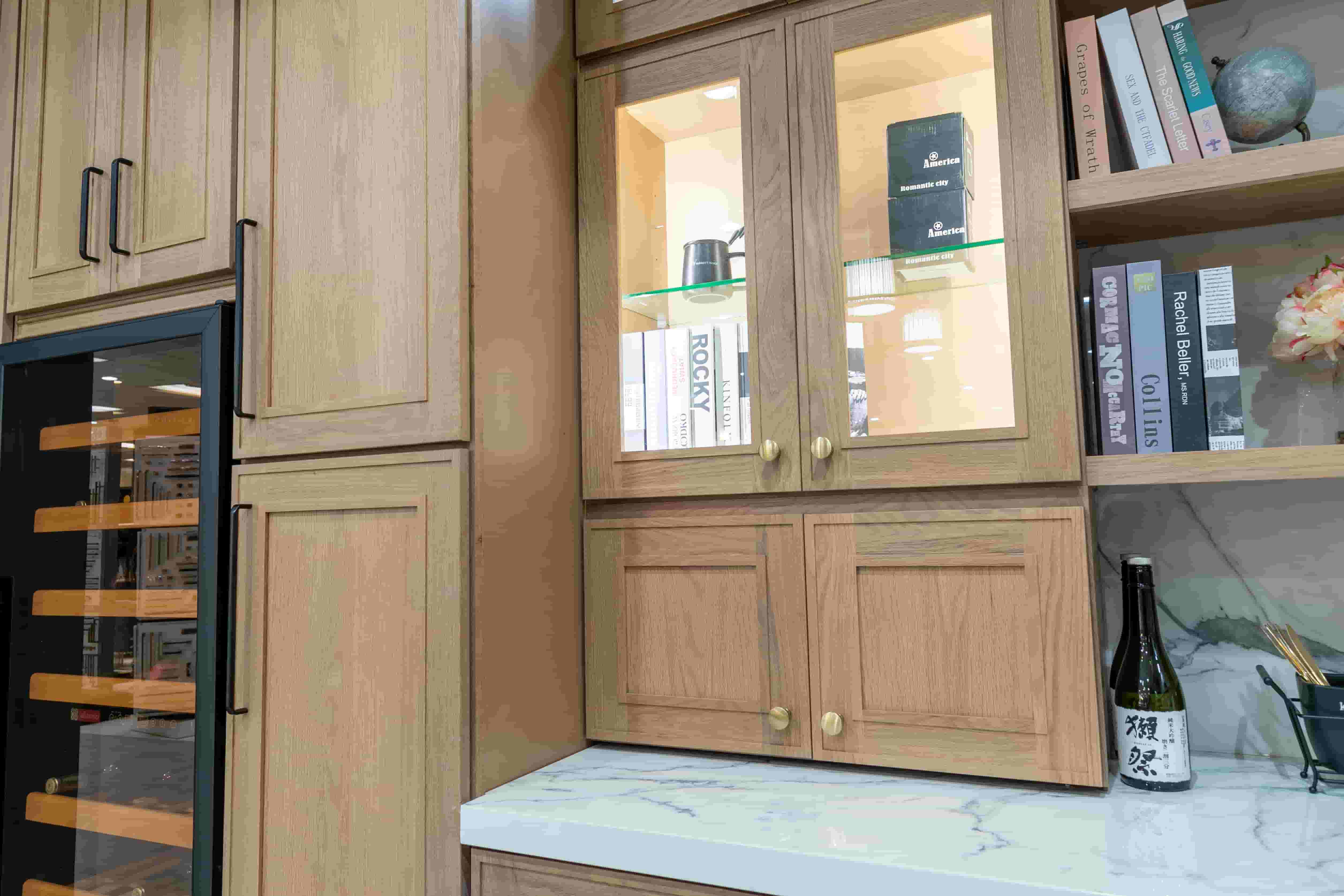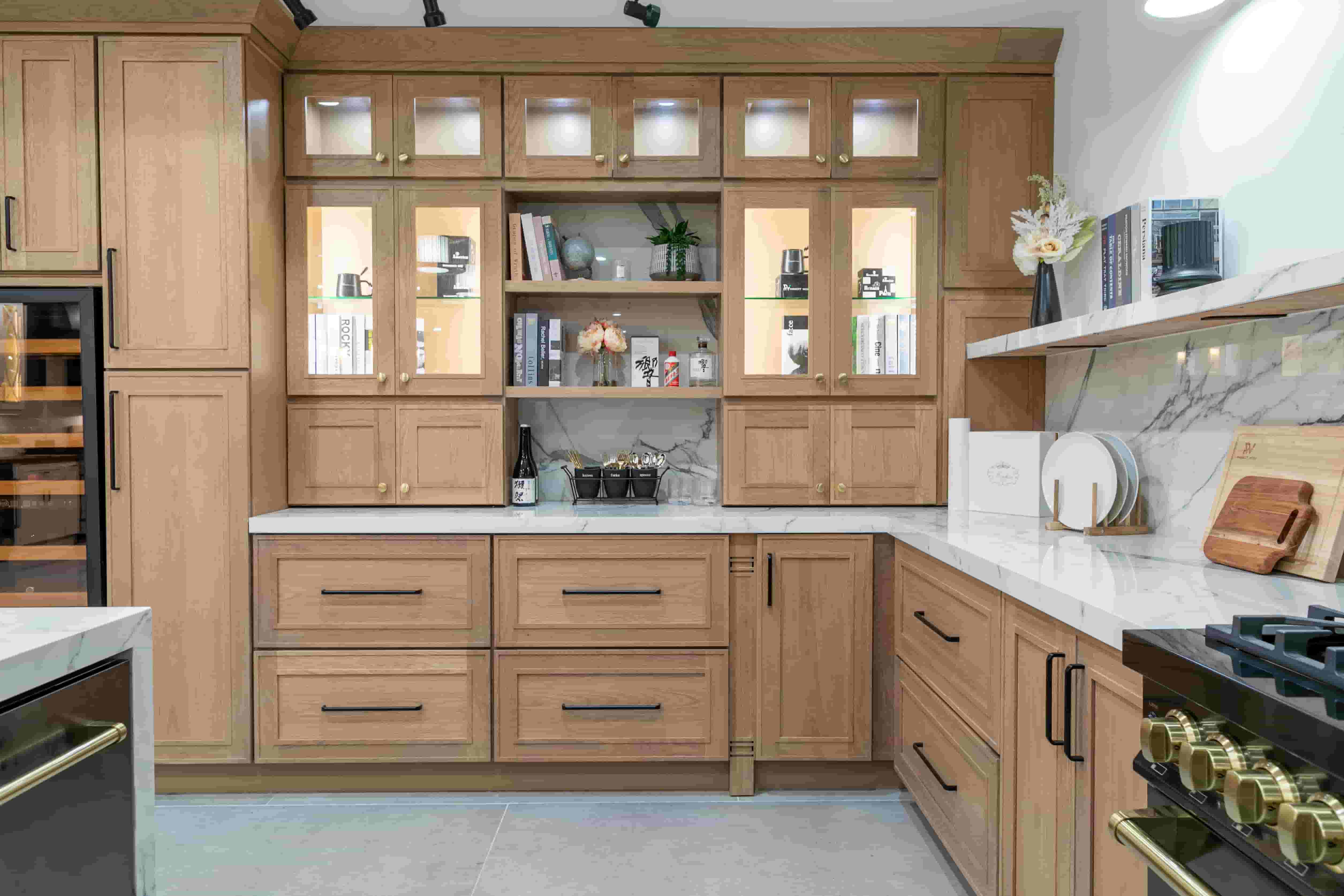 Combinando gabinetes de cocina de roble de diferentes colores, se mejora la experiencia visual. Las puertas transparentes satisfacen las necesidades de los clientes, aportan luminosidad a la cocina y se adaptan perfectamente a los requisitos de la decoración moderna.