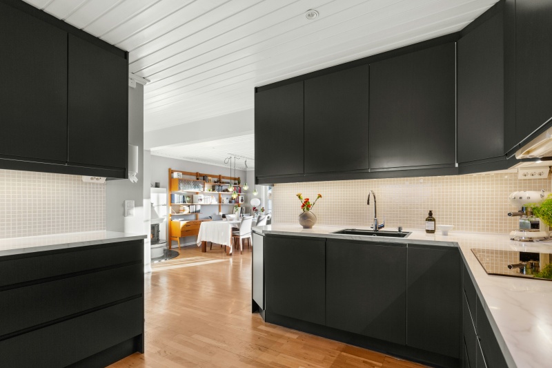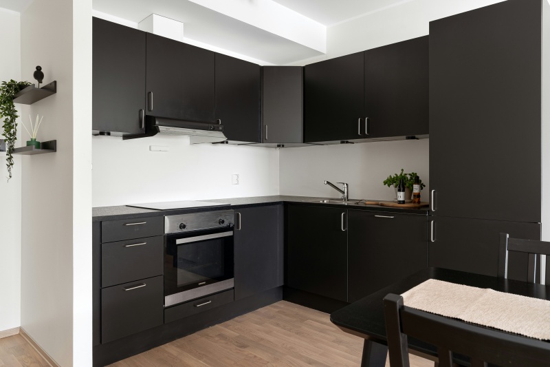Los gabinetes de cocina sin marco y de panel plano pintados en negro mate disimulan eficazmente pequeños rayones, y las puertas negras también disimulan bien las manchas, facilitando la limpieza diaria. Además, el negro no es excesivamente ostentoso, pero posee el atractivo visual perfecto, creando una cocina minimalista que irradia personalidad.