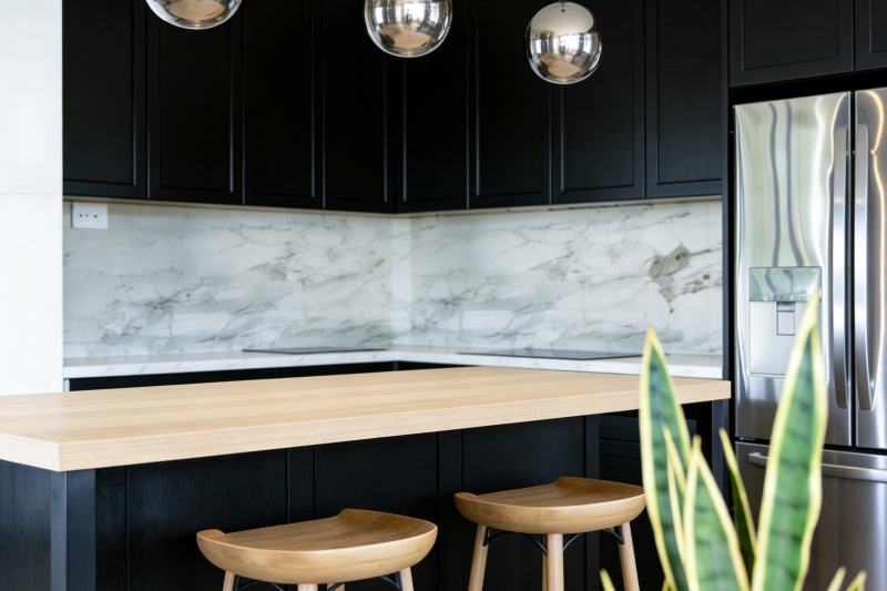 R: Puedes optar por puertas de vidrio para los gabinetes de pared para reducir la sensación de pesadez de los gabinetes negros. Como alternativa, añadir más fuentes de luz hará que la cocina se vea más luminosa.