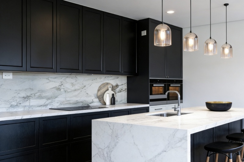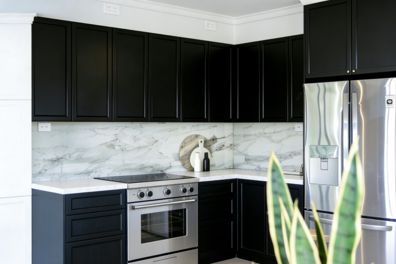 Guía de estilo para gabinetes de cocina delgados con marco Shaker pintados en negro mate