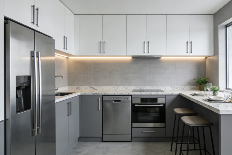 P3: ¿Cómo mantener los gabinetes de cocina sin marco personalizados de dos tonos gris y blanco?