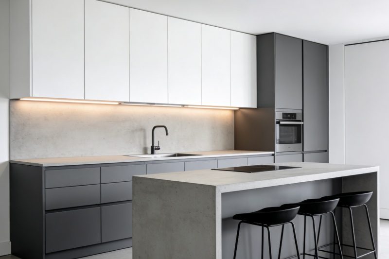 Gabinetes de cocina sin marco personalizados en dos tonos gris y blanco