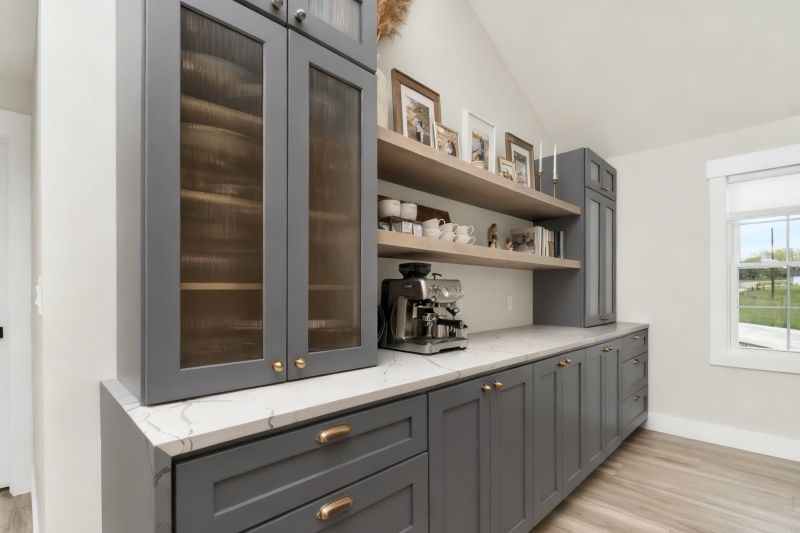 Configuración detallada de gabinetes de cocina con marco estilo Shaker gris