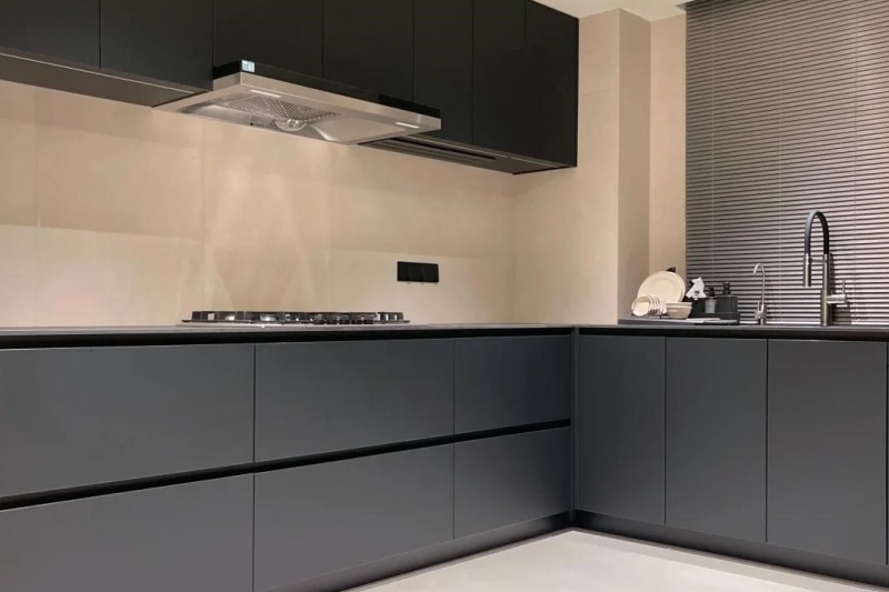 La mayor ventaja de los paneles de melamina con tecnología de enchapado es que evitan las diferencias de textura entre paneles individuales. Si elige gabinetes de cocina de madera maciza sin tratamiento superficial, la veta de la madera en las puertas puede variar debido a las diferencias entre los lotes de madera. Por lo tanto, para mantener la uniformidad de la apariencia del gabinete, se suele optar por gabinetes de losa negra mate sin marco.