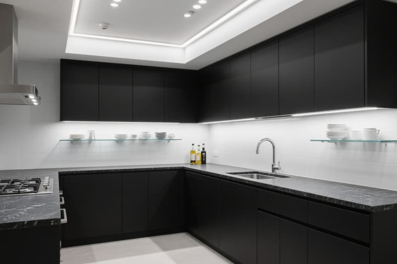 Gabinetes modernos sin marco de losa negra pulida para proyectos