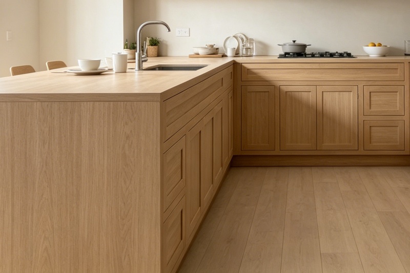 Presenta una estructura interna laminada cruzada, formada mediante prensado a alta temperatura y alta presión, lo que la hace más adecuada para ambientes húmedos de cocina que la madera maciza. Además, tiene un menor costo y una excelente relación calidad-precio, lo que la convierte en la opción principal de material base para proyectos comerciales de presupuesto medio a alto.