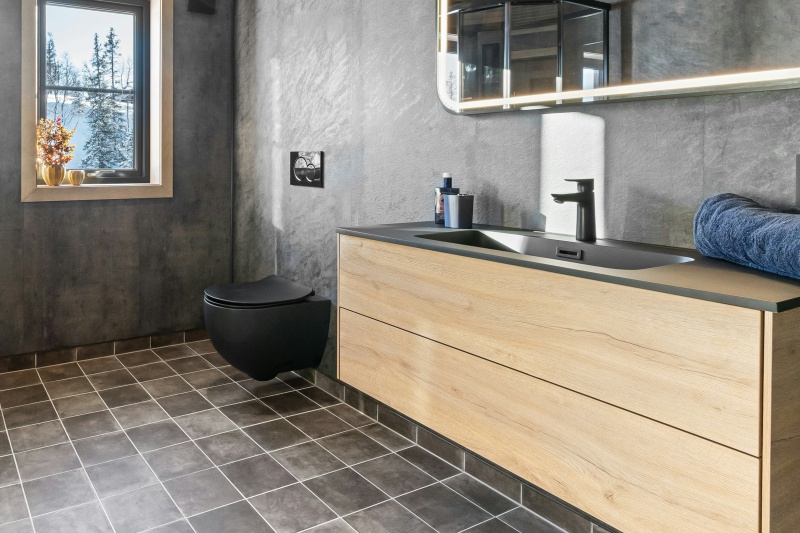 A: Para las encimeras se suele utilizar piedra de cuarzo o madera maciza, mientras que los lavabos se combinan mayoritariamente con cerámica o acero inoxidable negro mate.