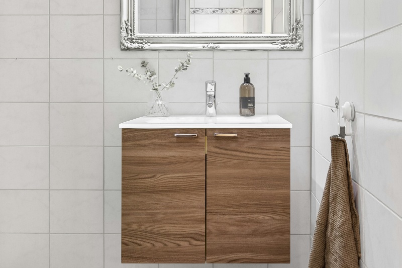 Recomendamos los lavabos suspendidos. Su diseño sin patas ahorra espacio y crea una sensación de mayor amplitud; los armarios demasiado grandes pueden resultar agobiantes, por lo que no son adecuados para baños pequeños. Además, el espacio bajo los lavabos suspendidos ofrece almacenamiento adicional para un uso práctico y facilita la limpieza.