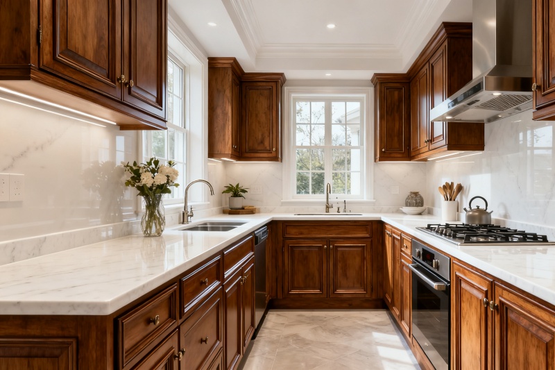 La combinación de encimeras de cuarzo blanco y gabinetes de roble prolonga la vida útil de los gabinetes de cocina. Ambos materiales destacan por su rendimiento, combinando estética y funcionalidad, y son ideales para proyectos en diversos espacios de alta gama. También ofrecemos servicios de proyectos personalizados para satisfacer necesidades específicas.