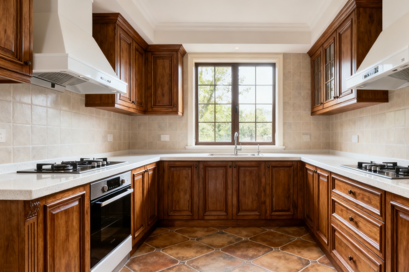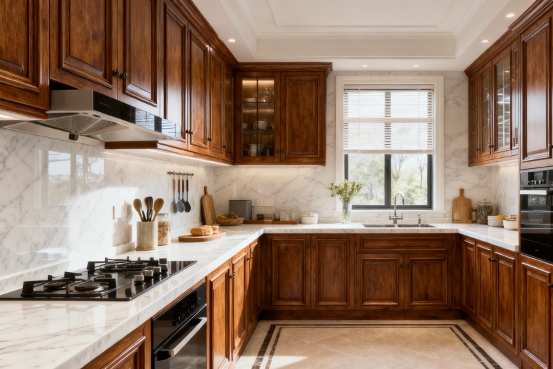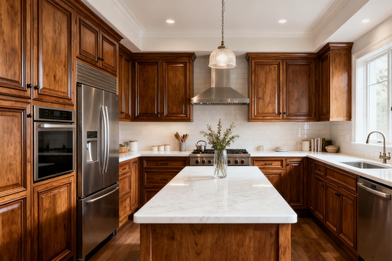 Puntos clave de la combinación: Adopte gabinetes de roble rojo con un ligero acabado vintage y combínelos con encimeras de cuarzo blanco con texturas de arena fina. Extienda una barra de desayuno desde la isla central y combínela con sillas de comedor de ratán y lámparas colgantes retro de latón para realzar la calidez del espacio.