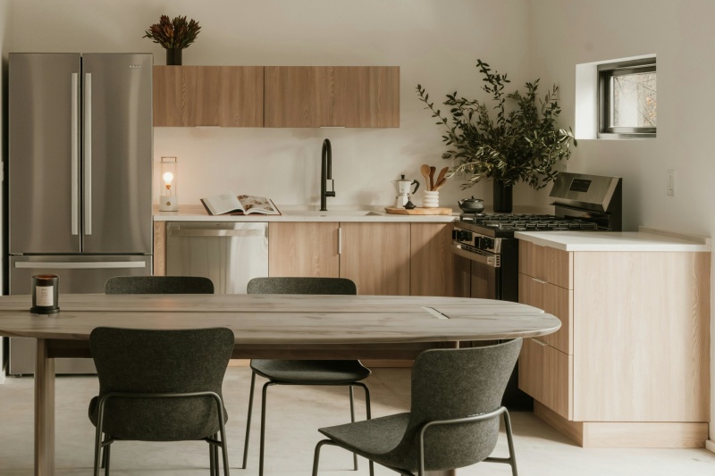 Se utiliza madera contrachapada de manera uniforme, con chapas de melamina resistentes a la humedad adheridas a los paneles laterales y traseros para resistir el ambiente húmedo de la cocina.